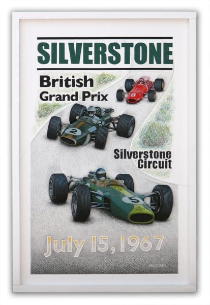 For example, the Clark Lotus 49 is built from 9 separate illustrations, cut out, and assembled in layers to create a “trompe l’oeil”. The 3 cars are done like that, and positioned into their 1st, 2nd, and 3rd race finishing order. The “Silverstone” text is also cut out paper…