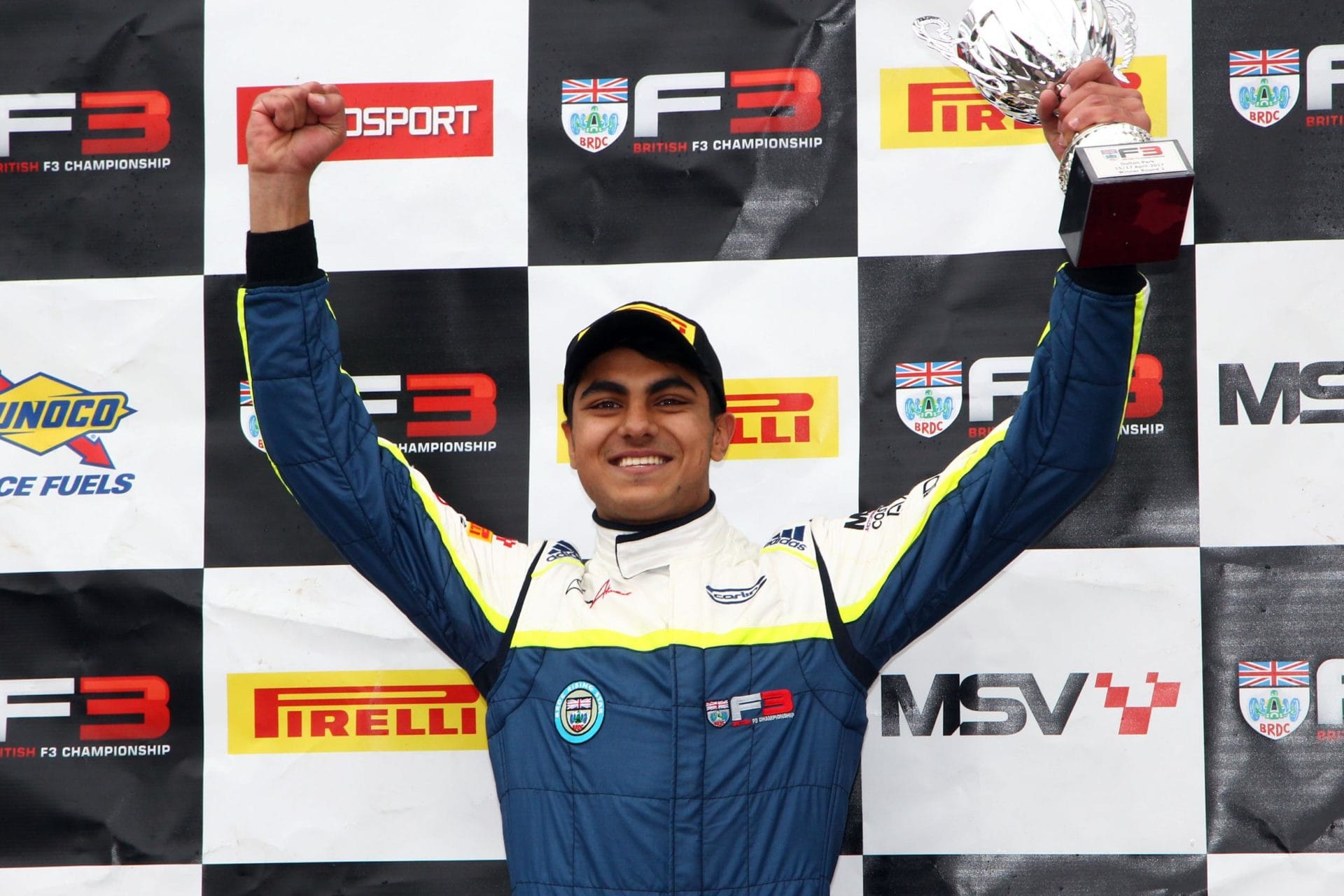 In the 2017 British F3 season, Enaam started with perfect score, winning all three races in the opening round at Oulton Park. Victory in race 2 was very special as he came through from eighth on the grid to take the chequered flag.